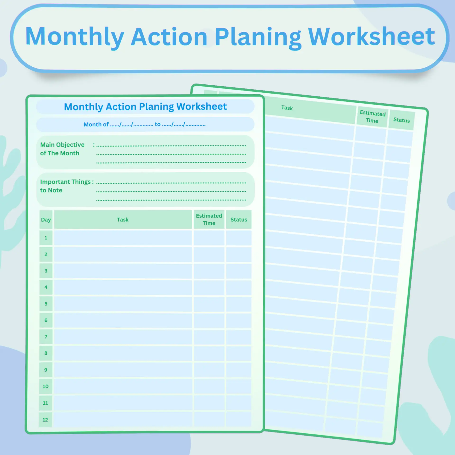Feeling swamped this month? Tame your to-do list with our monthly action planning worksheet! Set a clear goal, break it down into daily tasks with estimated times, and conquer your month!